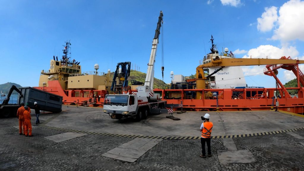 No início de maio, por exemplo, o terminal recebeu, simultaneamente, duas embarcações do tipo PSV (platform suport vessel, navios de apoio a plataformas de petróleo), atracadas a contrabordo, como você pode acompanhar pelo vídeo neste post. Isso foi possível porque o berço tem capacidade para operar com navios até 95 metros de comprimento e 32,49 metros de boca máxima – e, no caso de embarcaçóes atracadas a contrabordo, até o limite máximo de 36 metros das bocas somadas.